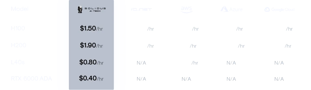 GPU pricing. Consistently 30–40% cheaper on every hardware tier we offer.